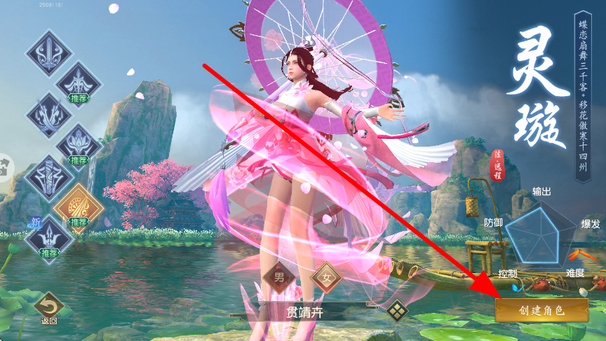 1、新手玩家开局,可以选择不同的职业角色,像灵璇等,选择心仪的职业确定角色后,点击创建角色,为开启做好准备。