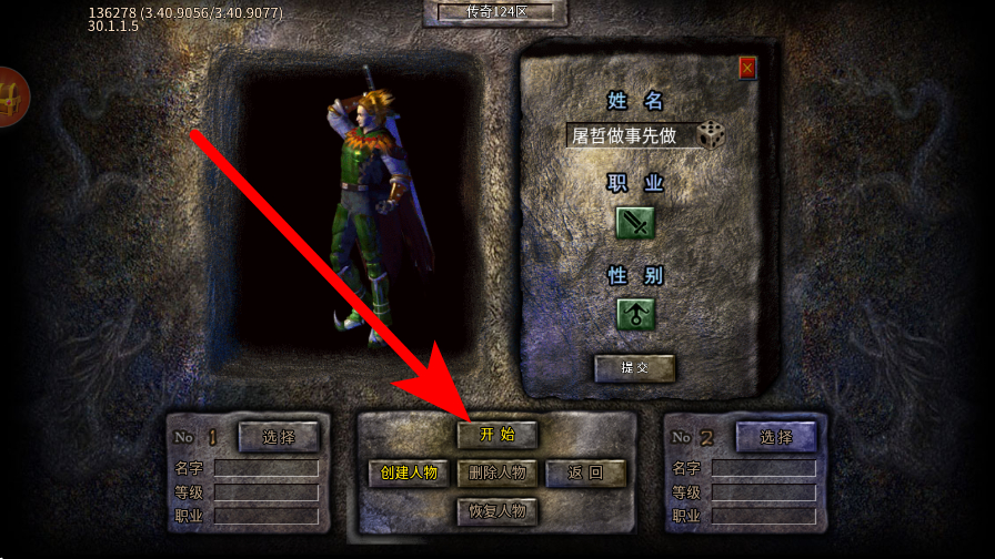 1、玩家创建角色职业,可设置姓名、选择职业、性别等,打造出符合自己心意的角色形象,之后点击开始,开启热血战斗旅程。