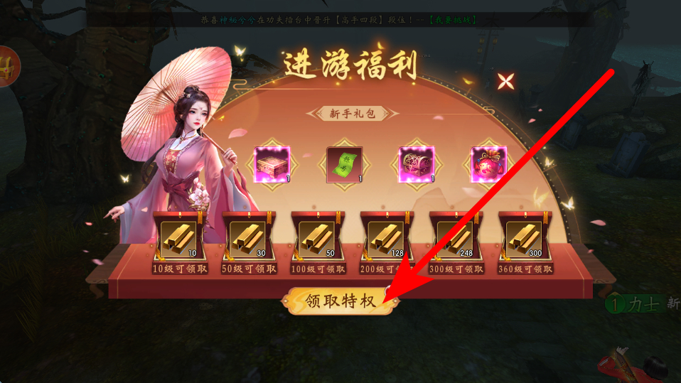 4、最后领取开服福利,在开服期间,会有专门的福利界面,达到相应等级或满足条件后,点击领取特权等相关按钮,领取开服福利,助力冒险。