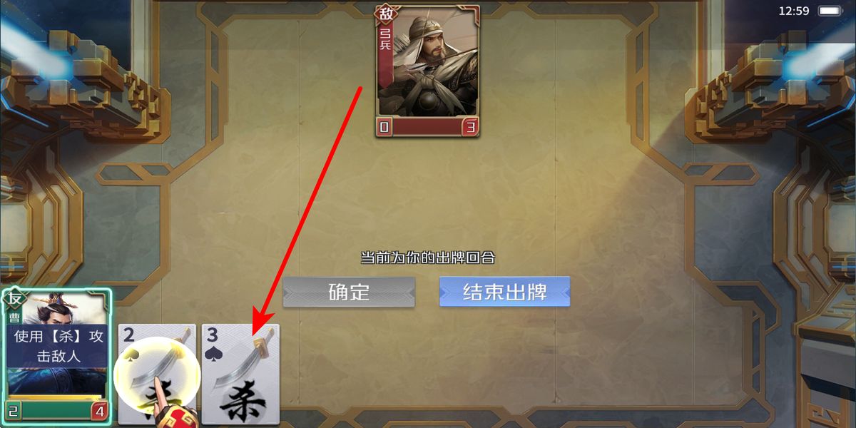 2、进入对战后,在出牌的回合,点击手牌中的杀等攻击卡牌,选择敌人为目标,释放攻击,利用卡牌技能与策略,争取击败对手赢得胜利。