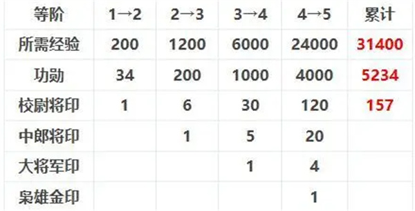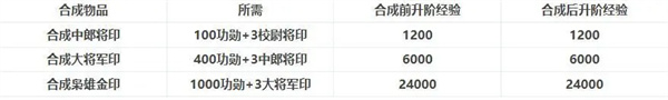 之前的升阶规则下,如果缺少对应的升阶将印,只能通过低阶将印和功勋来合成高阶将印才能实现升阶,而且将印合成是不可逆的。现在来对比一下在新版升阶规则下,将印合成前后升阶经验的差异。