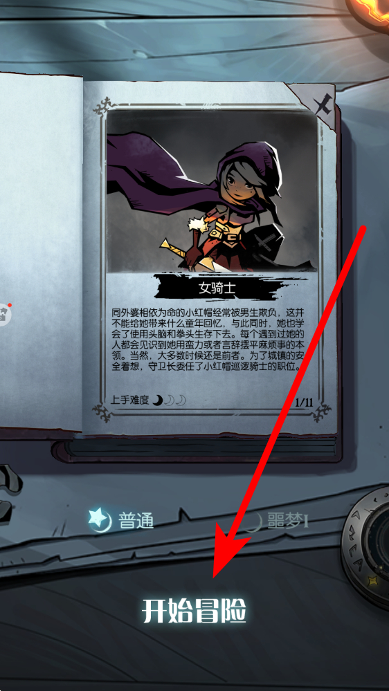 1、点击女骑士职业卡,了解其与外婆相依、习得生存技能的背景,该职业上手难度低,适合新手,确认后点击开始冒险,奠定近战攻防的战斗基调。