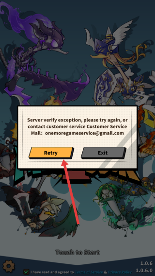 3、若出现服务器验证异常提示,点击黄色Retry按钮,重新尝试连接服务器,继续游戏进程。