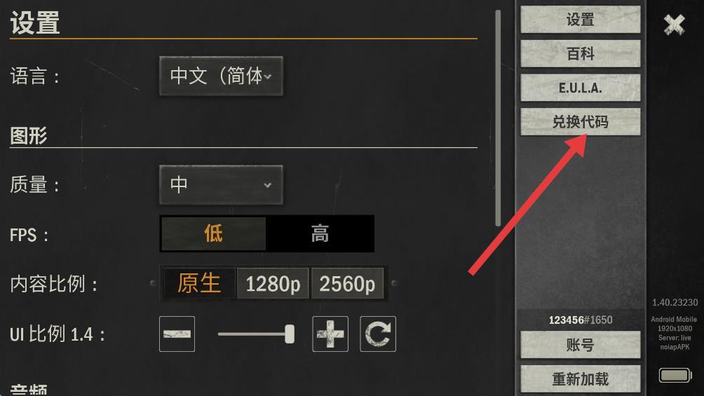 2、在弹出的设置界面右侧选项栏中,找到并点击兑换代码按钮。