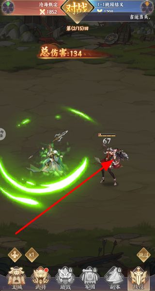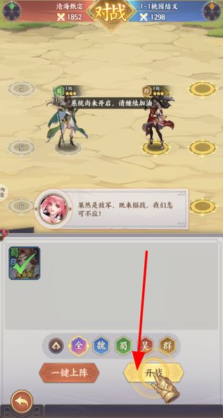 2、玩家进入对战界面后,选择对应阵营的武将调整对战位置,点击开战按钮开启关卡战斗。