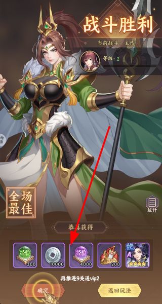 4、战斗胜利后会提升等级,同时获得经验金币等奖励,还能得到武将卡牌,点击确定按钮可领取奖励。