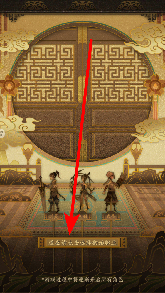 1、职业选择进入游戏,在初始界面选剑灵、飞羽、武圣任一职业,点击道友请点击选择初始职业,确定后开启修仙之旅,后续将逐步解锁其他角色。