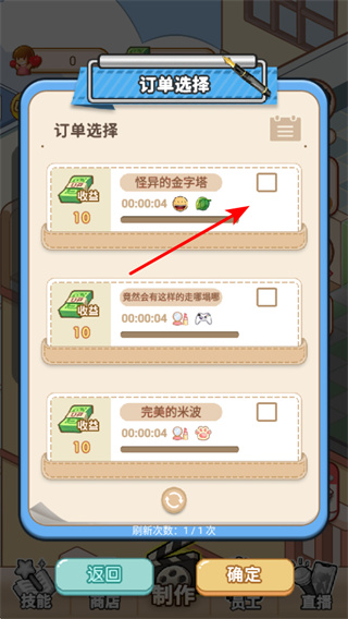 3、在订单选择界面,勾选如怪异的金字塔之类的订单,这是承接制作任务的关键操作,勾选后可开始制作并获取相应收益。