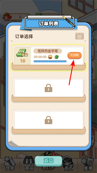4、当订单完成后,点击可领取按钮可获取订单收益,这是积累资源的关键操作,及时领取收益可用于后续店铺升级业务拓展。