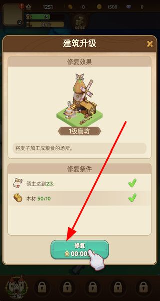 3、查看建筑升级界面的修复条件,当满足条件后点击修复按钮,升级建筑,解锁建筑的功能,助力领地发展。
