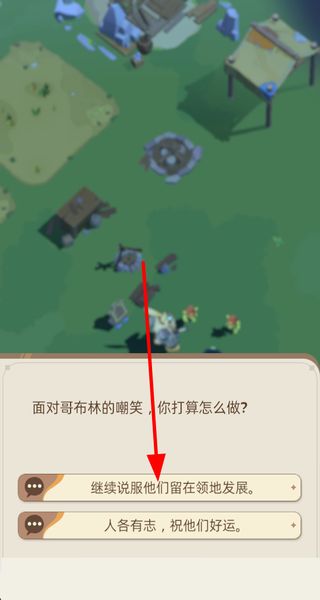 1、面对哥布林的嘲笑,选择对应的交互选项,决定是继续说服他们留下,还是祝福他们离开,推进领地剧情。