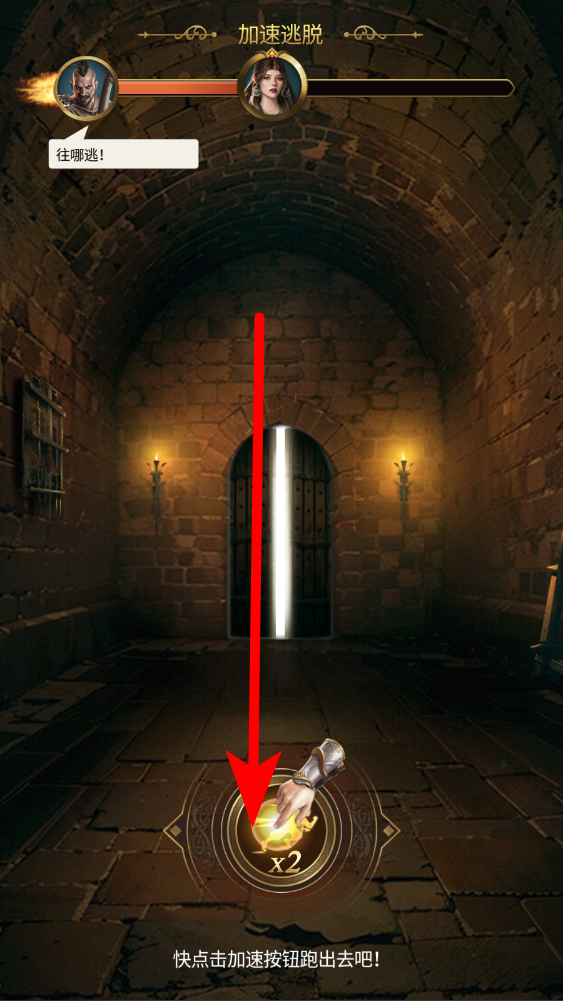 1、在主线剧情地牢的场景中,会有追击提示,此时需点击加速按钮,借助加速效果尽快逃离当前区域,为后续的冒险争取机会,开启体验的第一步。