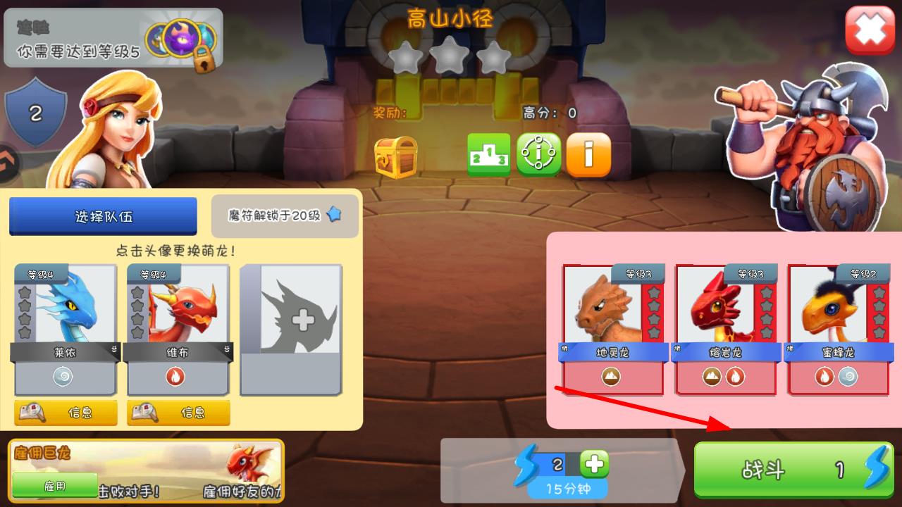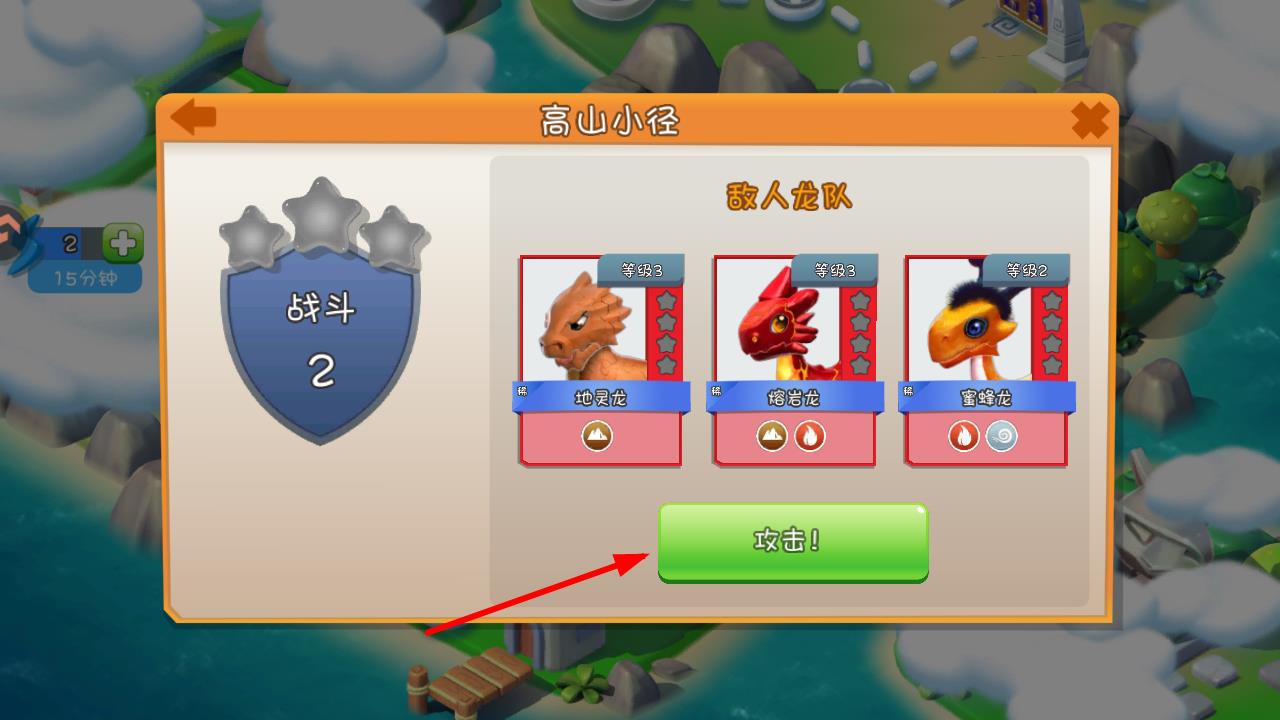 3、界面确认好敌人龙队信息,无需更换萌龙队伍时,直接点击绿色攻击按钮,即可向敌方龙队发起战斗,争取胜利获取星级评价与奖励。