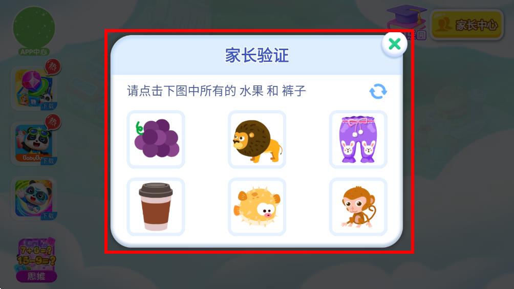 2、点击家长中心后,会弹出家长验证窗口,按照要求点击图中所有的水果和裤子完成验证流程。