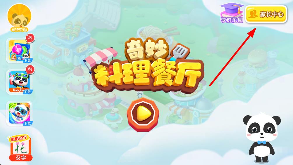 1、打开奇妙料理餐厅游戏,在主界面右上角找到家长中心按钮,点击进入家长操作相关页面。
