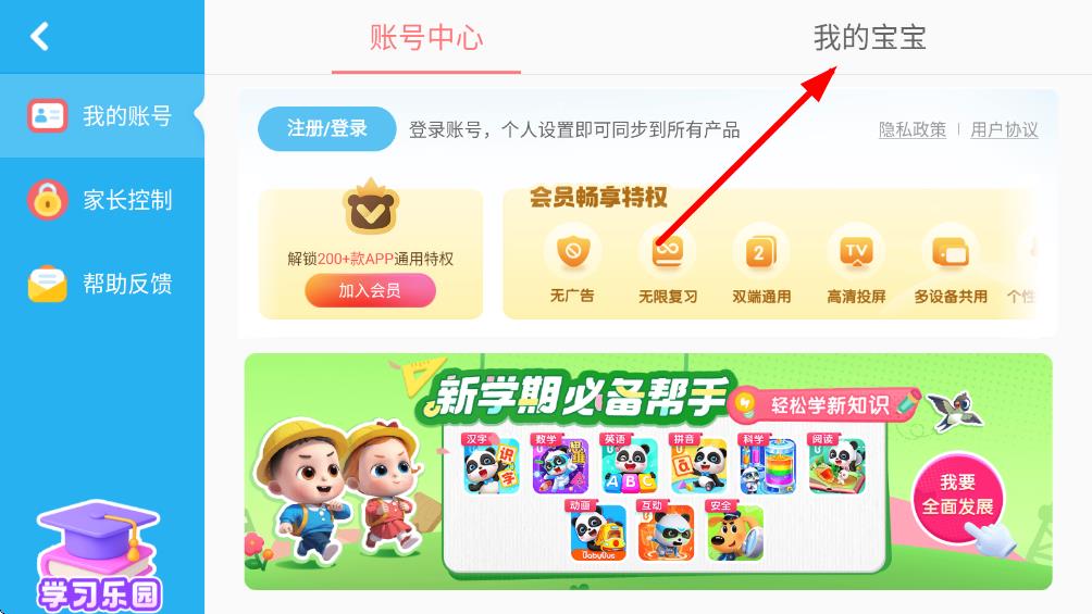 3、通过验证进入账号中心界面,点击界面右上方的我的宝宝选项,进入宝宝资料设置页面。