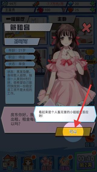 3、来了一位新租客,可以与他人进行合租赚取金币,点击可以后开启一段与人合租的阶段。