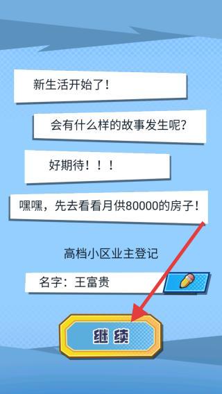 1、画面呈现了新生活开始的页面,玩家需要先指定自己的名字再去小区业主进行登记,填写后点击继续。