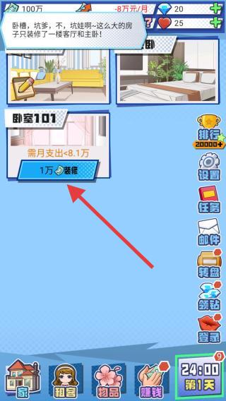 2、进入到游戏场景内,目前只装修了一楼客厅和主卧,玩家需要通过不断的赚钱来进行装修。