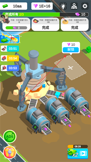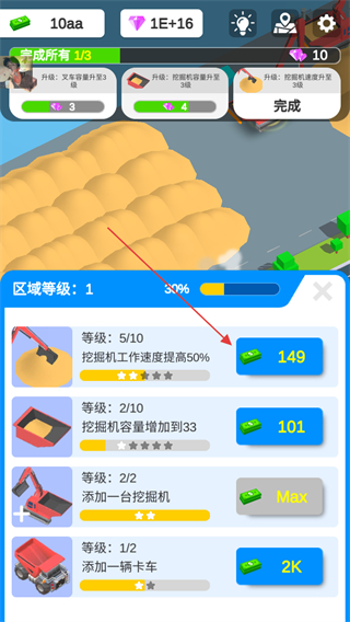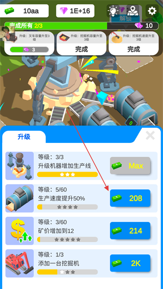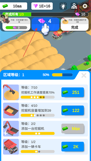 1、花费金币升级挖掘机,如提升工作速度,增加区域等级进度,同时可领取钻石奖励。