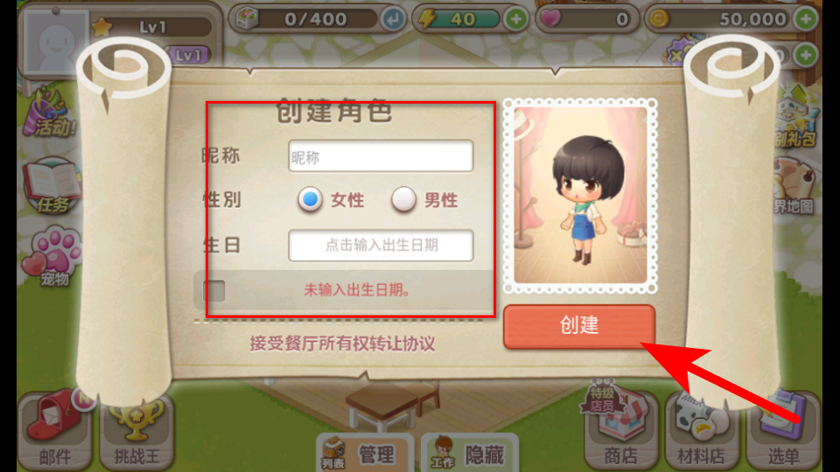 1、进入萌萌餐厅游戏,在创建角色界面填写昵称、选择性别、输入出生日期后,点击创建按钮,创建游戏角色。