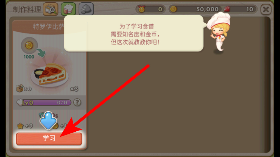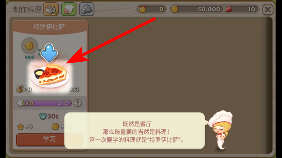 4、在料理学习界面,点击学习按钮,开始学习特罗伊比萨的制作食谱,开启餐厅料理制作的经营环节。