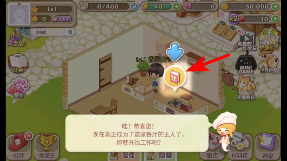 2、角色创建完成后,在餐厅界面点击带有书本图标的引导区域,开始餐厅经营的初始操作。