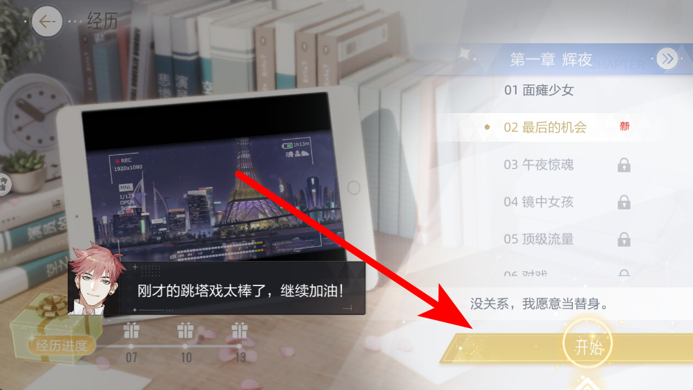 2、可看到不同章节,比如第一章辉夜下有多个小节,选好章节后点击开始,就能进入对应内容,跟随剧情感受演艺故事的发展。