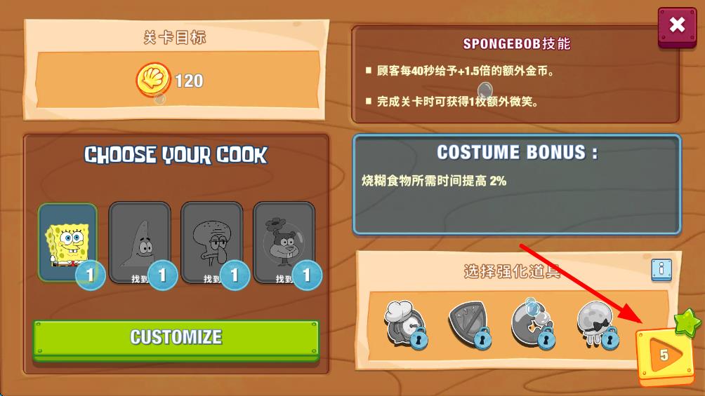 1、进入海绵宝宝大闹蟹堡王游戏关卡,可以在此区域选择厨师,还可购买强化道具区域的道具辅助,点击开始游戏。