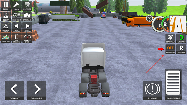 2、进入驾驶界面后,先点击ENGINE-IS按钮将引擎从OFF切换为ON启动车辆,完成车辆启动前的基础操作准备。