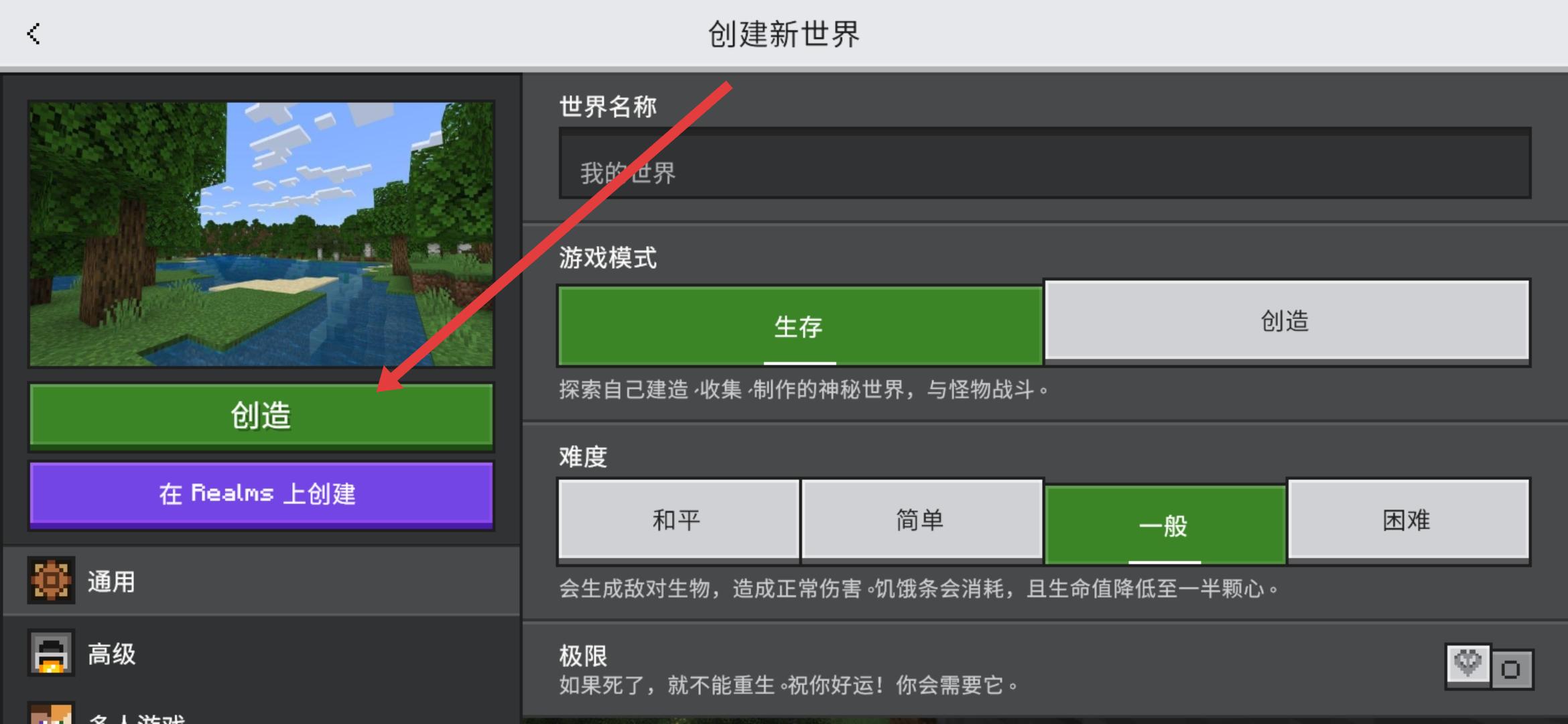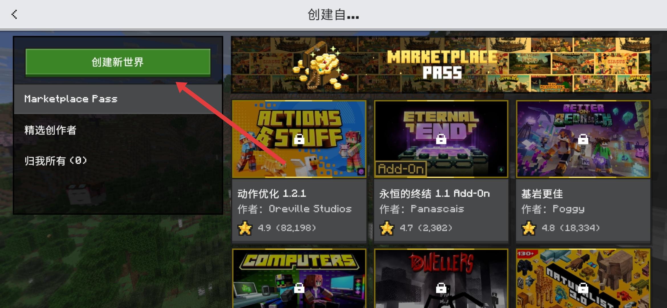 2、进入到创建自...的界面中,需要点击左侧绿色创建新世界按钮,进入世界参数设置的页面。