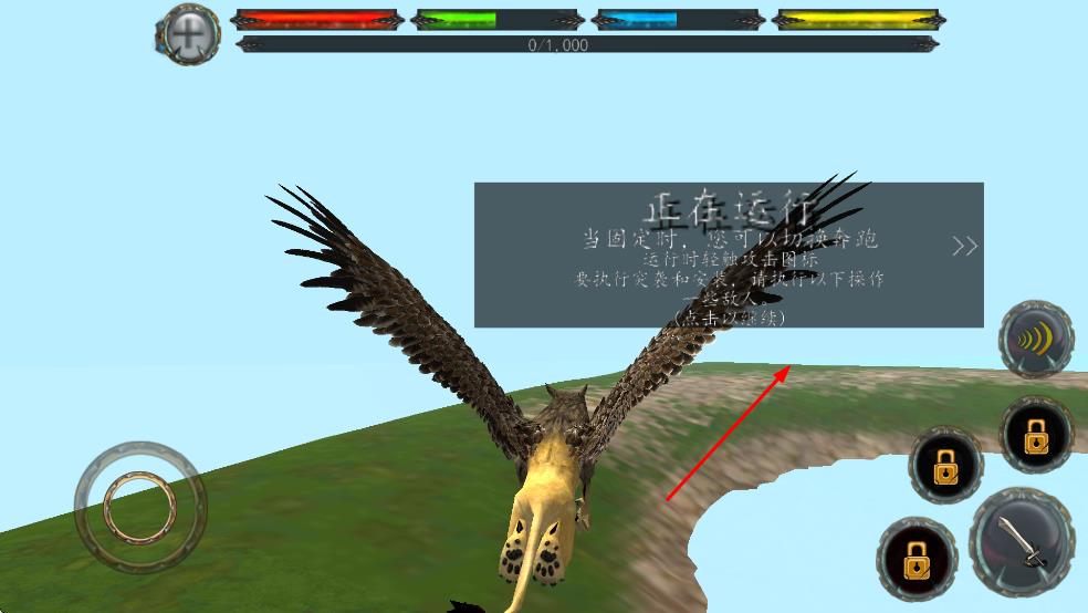 1、进入游戏后,看到“正在运行”的提示框,点击提示框以继续,此时可操控狮鹫类生物开始行动,准备探索游戏世界。