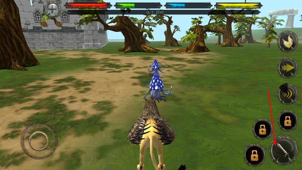 3、到达城堡附近后,发现蓝色带白点的敌人,点击右侧的武器图标,让狮鹫使用武器攻击敌人,展开战斗,尝试击败敌人。
