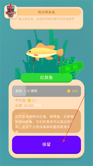 4、钓到红鼓鱼后,查看其介绍,点击保留按钮保存该鱼。