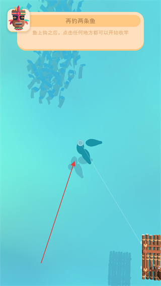 2、鱼上钩后,点击任意地方收竿,继续完成再钓两条鱼的任务。