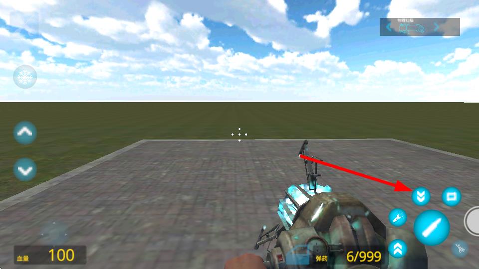 1、点击右侧箭头指向的按键,可切换武器或工具,适应游戏场景和操作需求,攻击、建造等。