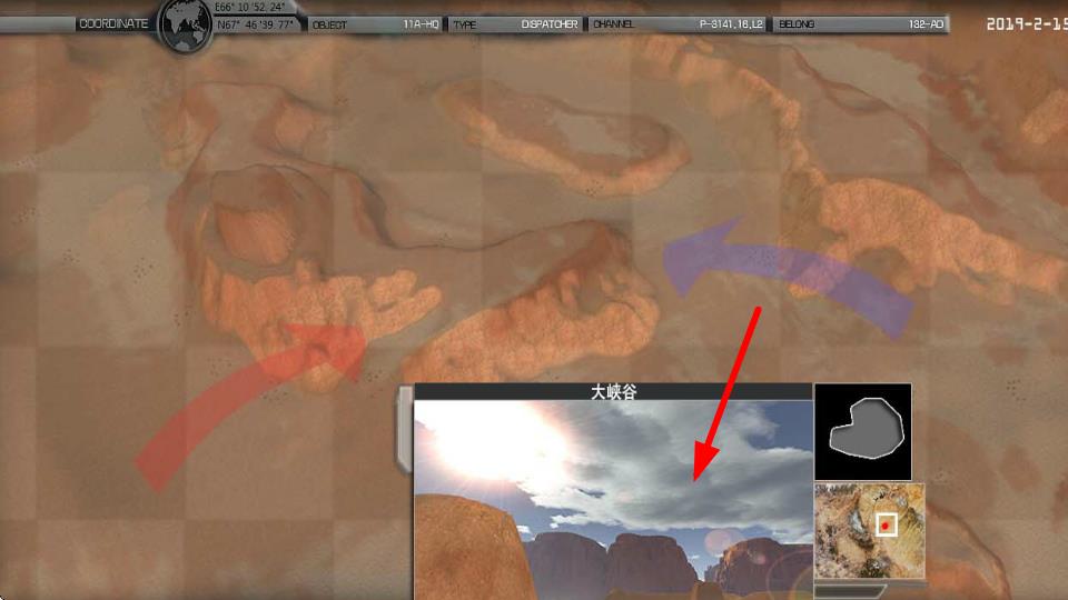 2、关注箭头指向的大峡谷战场,具有复杂的地势,可利用峡谷进行掩护或伏击,考虑地形优势。