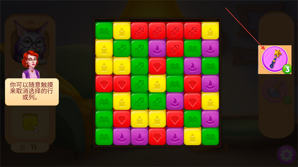 3、右侧的魔法棒等道具,有使用次数限制,可辅助完成消除,帮助应对较难的消除组合,提升闯关效率。