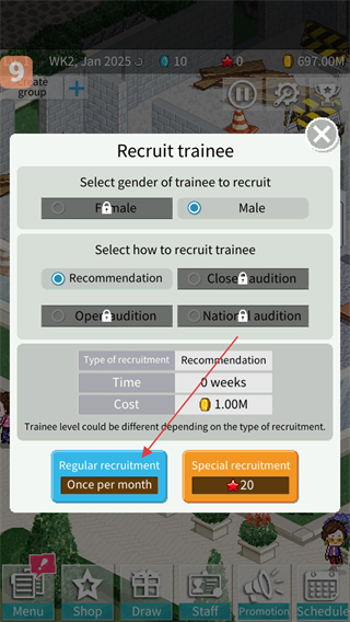 3、在招募界面选择性别、招募方式如推荐制,点击Regularrecruitment进行常规招募。