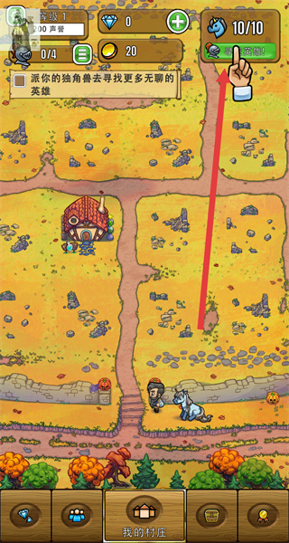 3、在村庄主界面,点击“寻找英雄”按钮,派遣独角兽外出寻找英雄,获取可供选择的英雄角色。