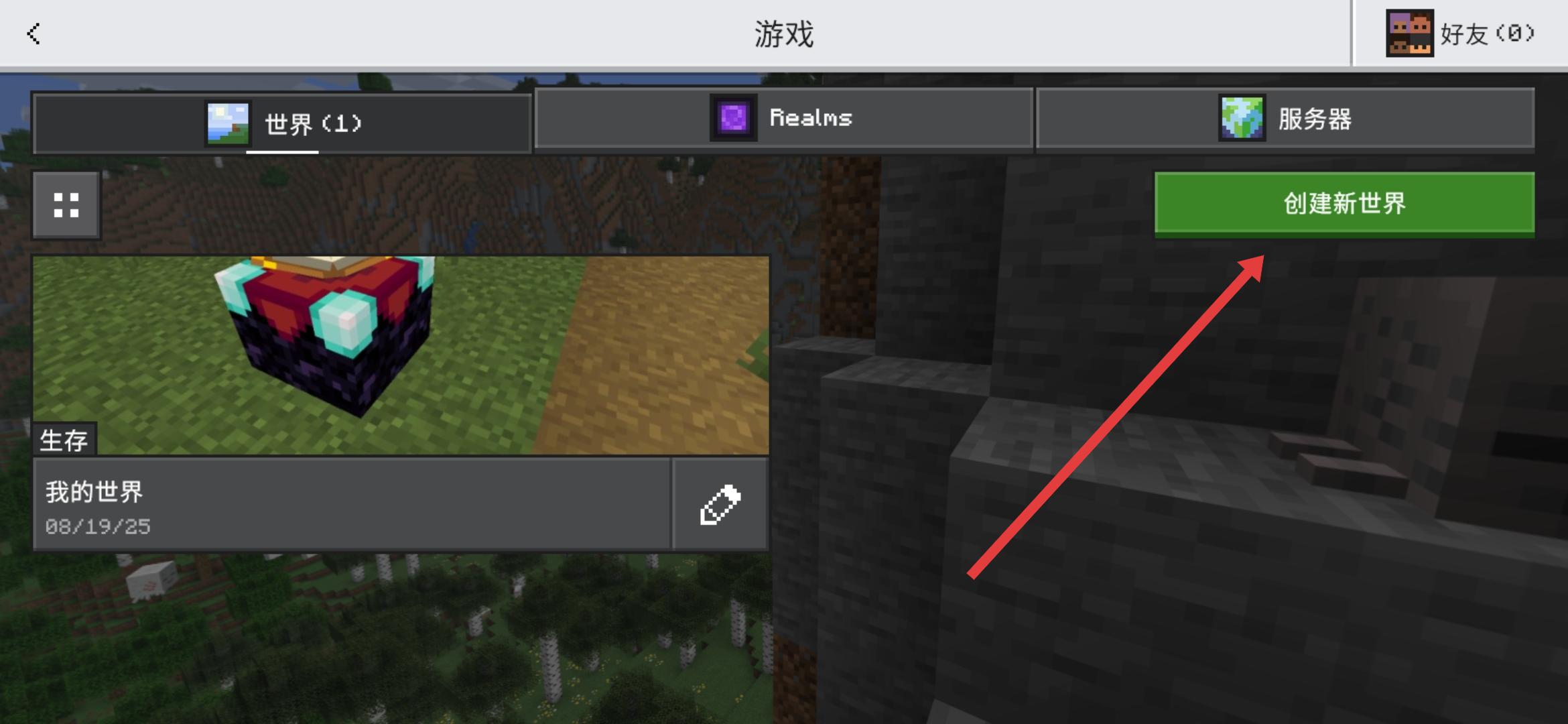 1、在我的世界游戏主界面中,点击右侧绿色的创建新世界按钮,开启全新世界的创建流程。