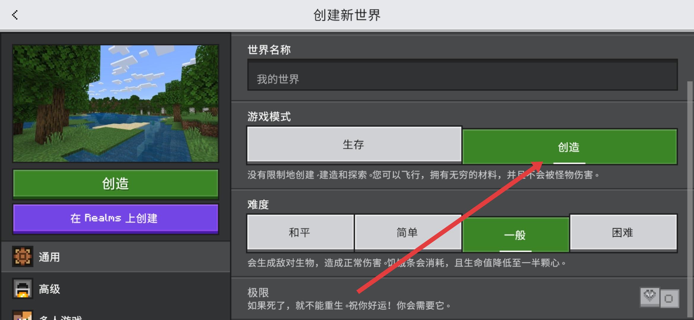 3、在创建新世界的设置界面里,点击创造模式选项,就能够开启拥有飞行、无限材料等特性的创造模式。