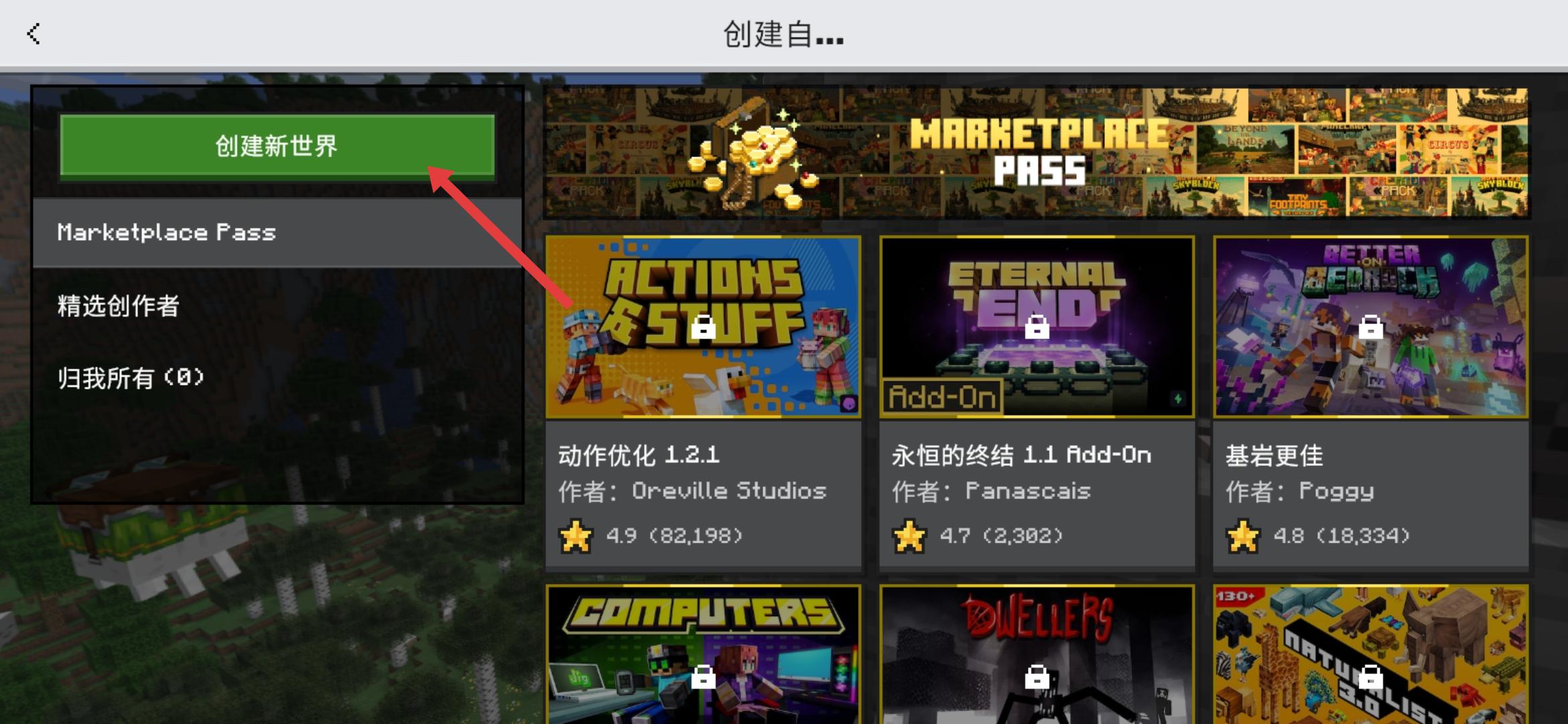 2、进入创建的选择界面后,点击左侧绿色的创建新世界选项,进入世界详细设置页面。