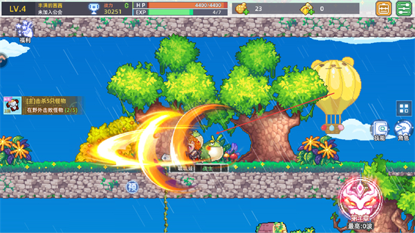 4、释放技能攻击野怪,完成击退5只怪物任务,积累经验提升至4级。
