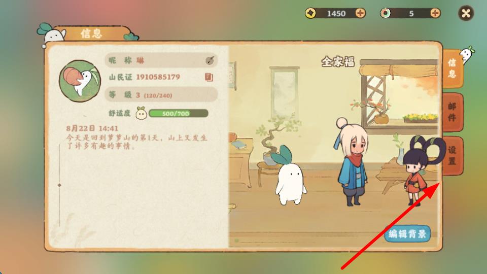 2、在个人信息界面中,能看到昵称、等级、舒适度等信息,在右侧一列选项中,点击设置按钮,进入游戏设置界面。