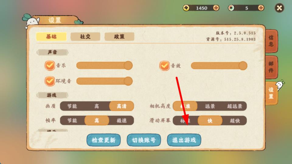 3、进入设置界面后,在下方可以看到检查更新、切换账号、退出游戏等蓝色按钮,点击退出游戏按钮,按照提示确认操作,即可退出游戏。
