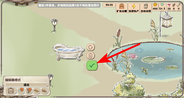 3、在编辑模式下布置好家具后,点击绿色对勾按钮确认布置,完成家园装饰操作,为青蛙打造舒适居住环境。