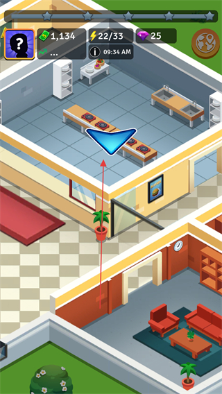1、跟随蓝色箭头指引,查看厨房区域,准备开启餐厅经营。