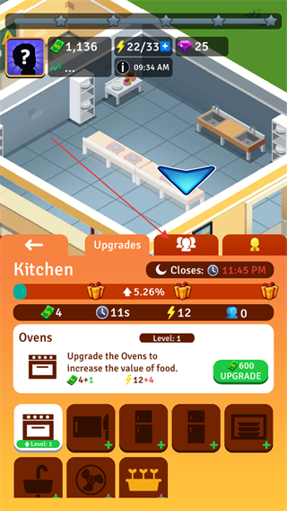 2、在Kitchen界面,点击UPGRADE升级烤箱,提升食物价值增加收益。