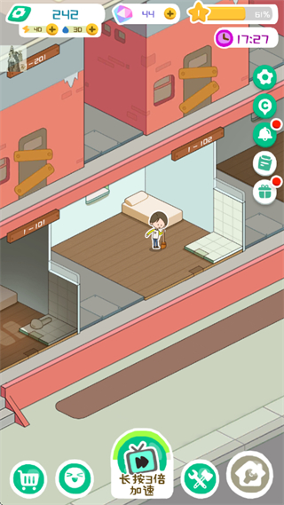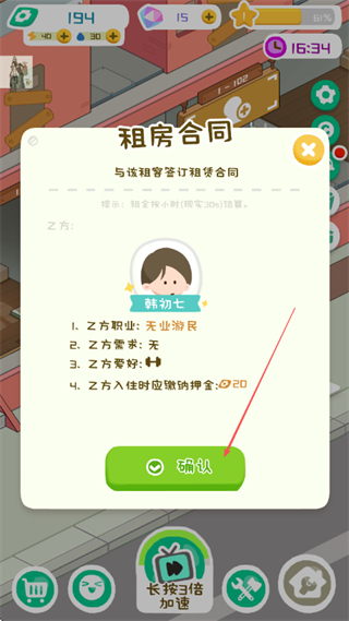 2、竖屏单指操作便捷省心,点击即可完成房间查看、租客招募、家具升级等操作,视野清晰覆盖全场景,通勤等碎片化时间也能轻松游玩。